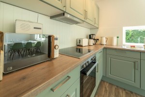 Moderne, lichtdurchflutete und gut ausgestattete Küche direkt am Wohnraum. Viel Stauraum für Lebensmittel.