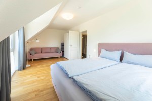Großes Elternschlafzimmer mit Ausblick auf Wiesen. Kleiderschrank mit Schiebetüren und Schlafsofa. Komfortables Boxspringbett (180 cm breit).