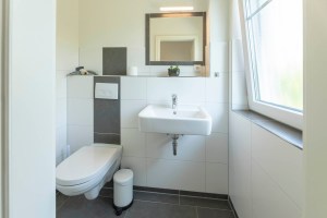 Modernes Bad im Obergeschoss mit Blick ins Grüne.