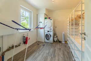 Hauswirtschaftsraum mit Garderobe und Schrank für Stauraum. Waschmaschine und Trockner für entspanntes Waschen im Urlaub.