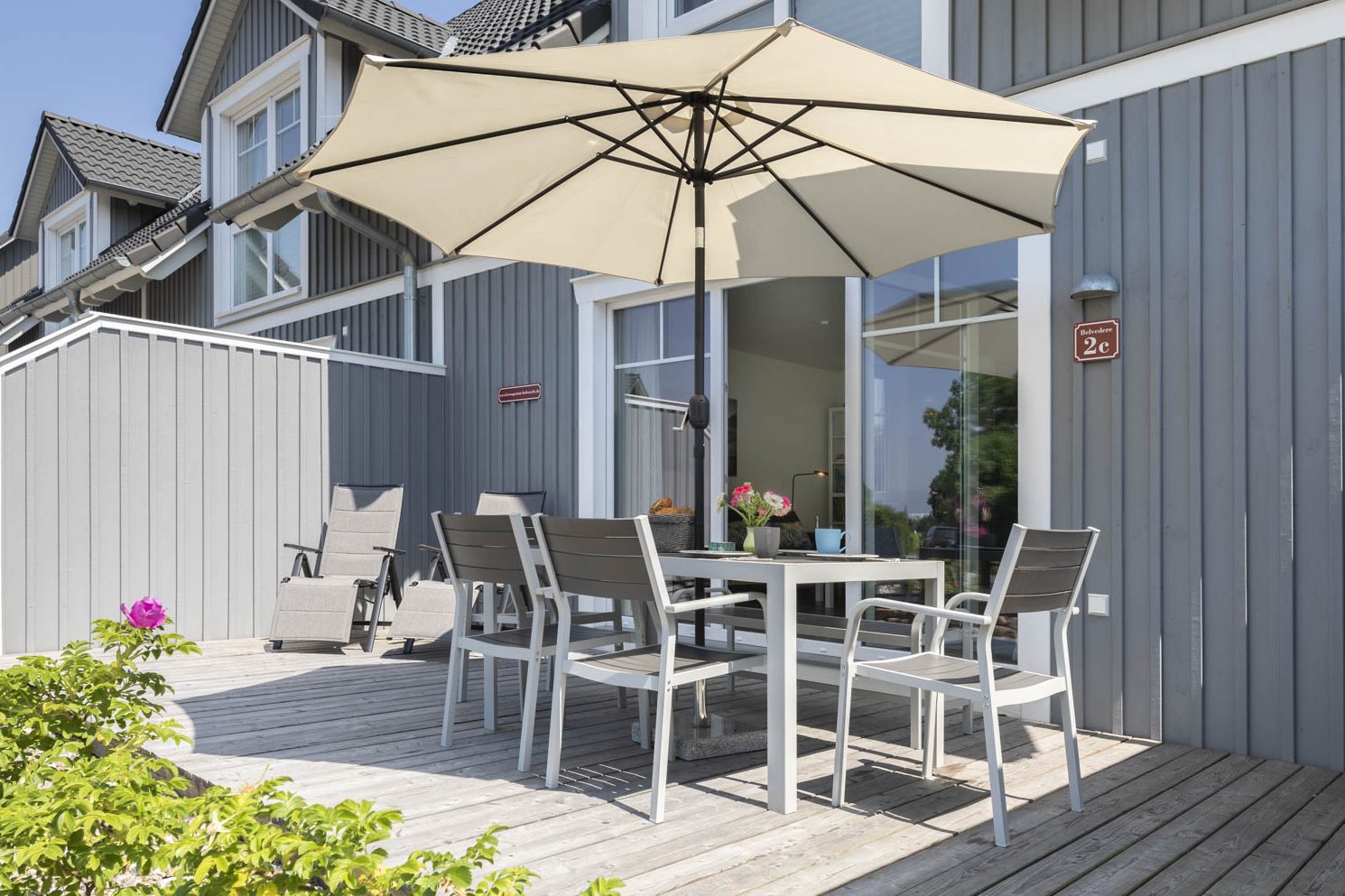 Schöne Terrasse mit 5 Stühlen, einer Bank und 2 komfortablen Liegen.